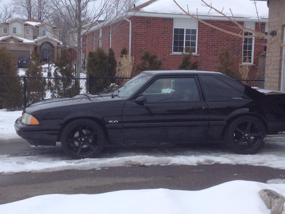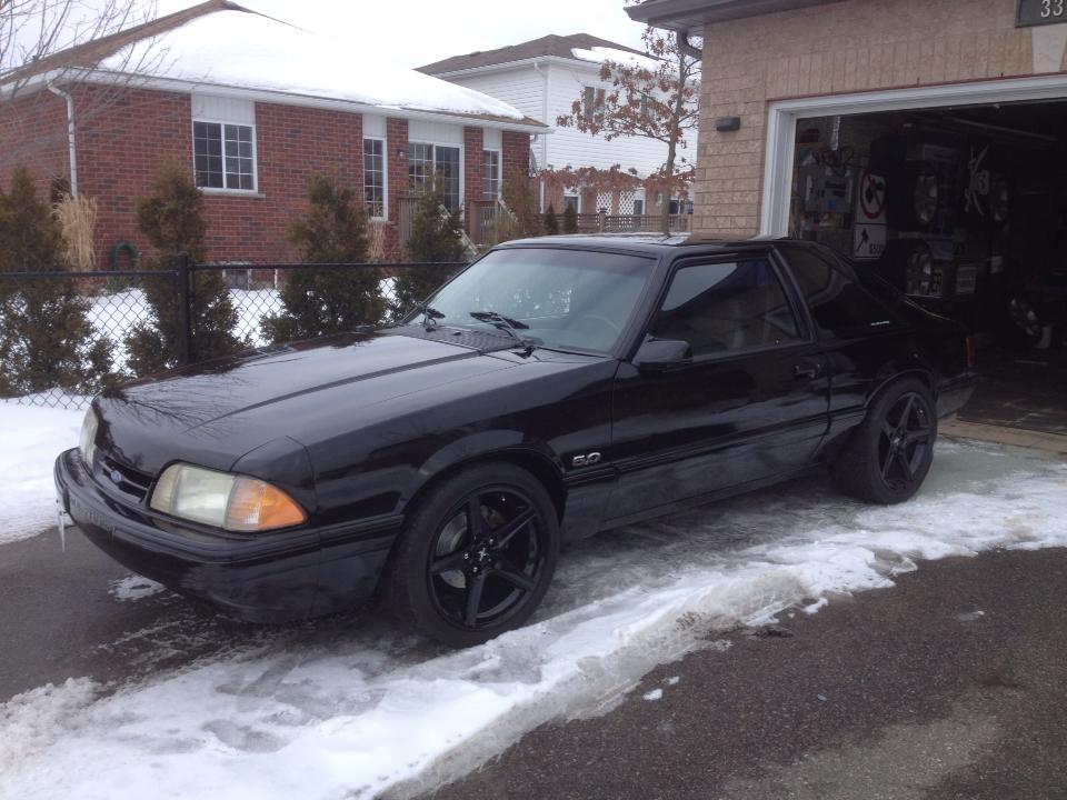 just to recap, 94 spindles with new wheel bearings, new brakes, including oem fitment cross drilled and slotted rotors,new calipers and pads, new 94 balljoints, 1" drop eibach pro kit, energy suspension spring isolators, 18" saleen rims with 245/40/18's on all corners, 9" wide +24 offset, new oem gt kyb shocks and struts, 1" hub centric/wheelcentric spacers in rear. also put in an electric fan with adjustable stat, balancing my temps right at the half way point on the stock gauge.