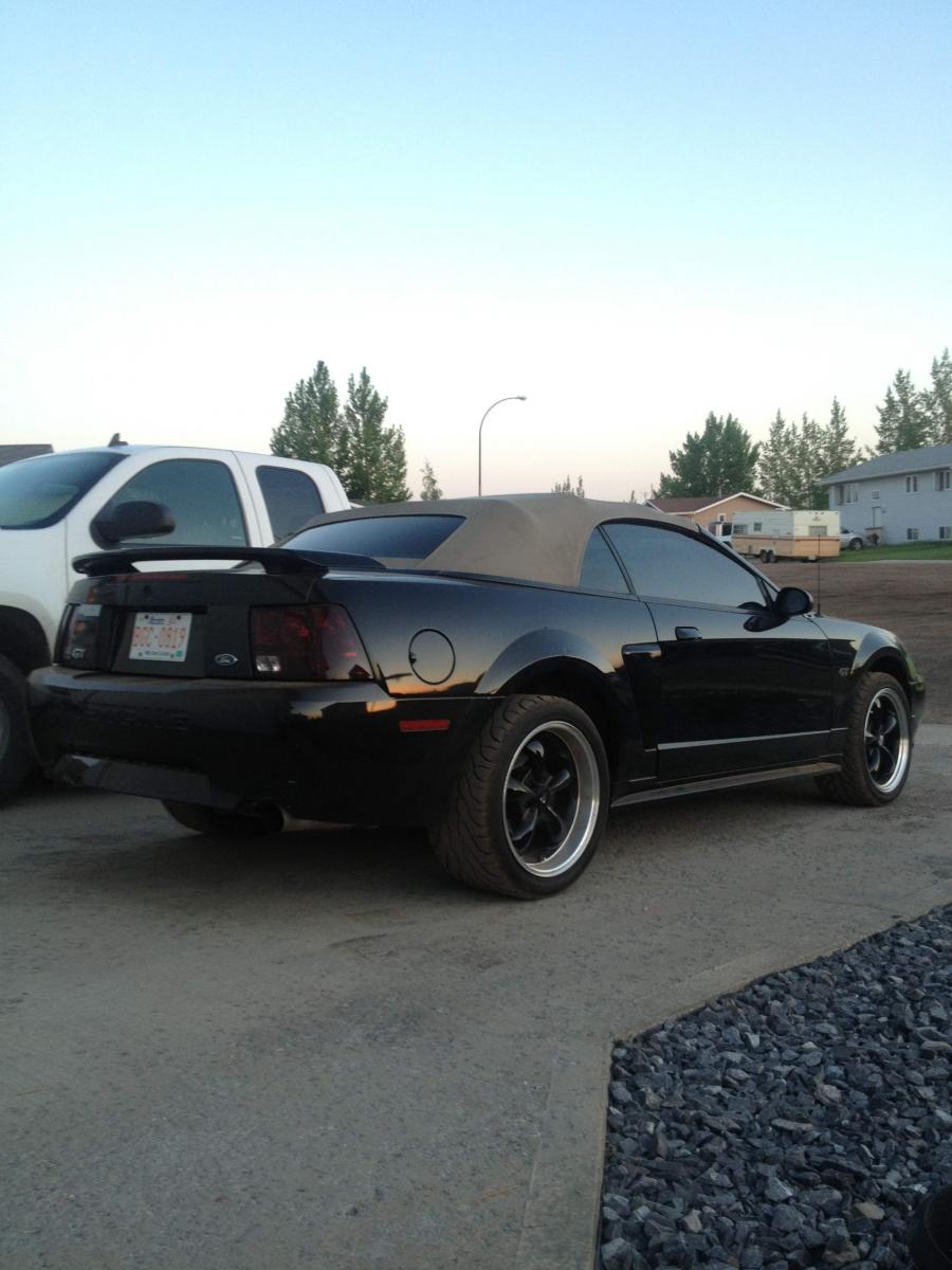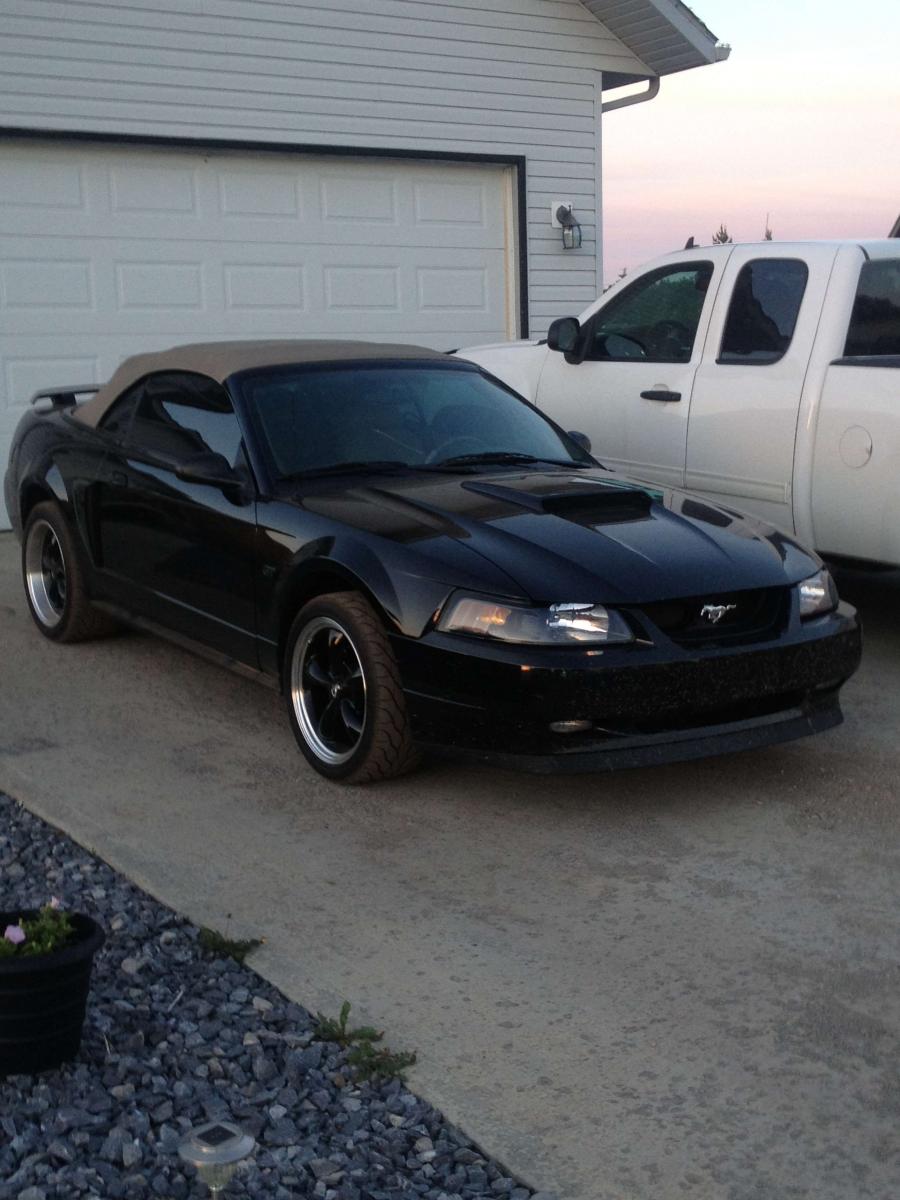 ME!!!! I'm back in the Mustang world, as of 3 hours ago. I just picked up a 2002 GT vert, Black on Tan with a 5 speed and 124,000 kms. It's pretty close to stock, with mild mods such as: Cold air intake, cat back magnaflows, Hurst shifter, Mach I chin spoiler, and a couple other little things. The first things I'm doing to it is changing the gears, probably to 373's, and light bar. Here's a couple pics from my phone. Once I get her all cleaned up I'll post better pics, but I'm glad to be back in a Stang!!!!