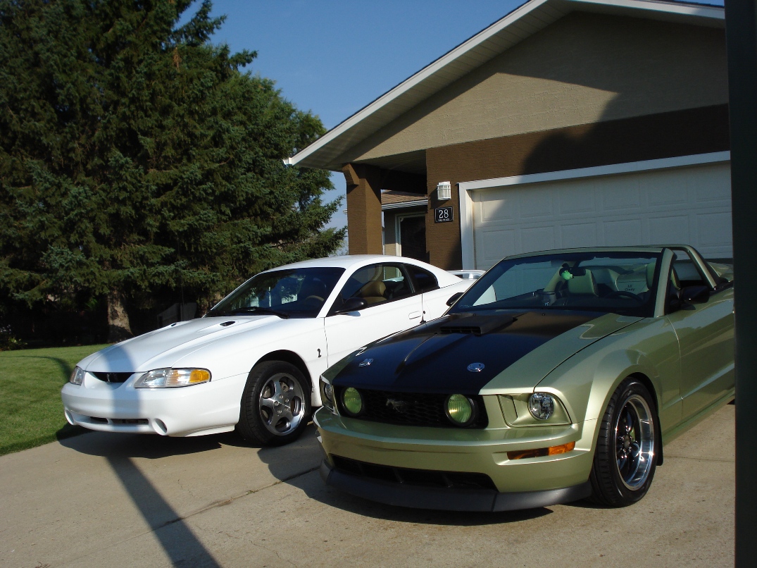 Just got my Limer back from body shop after 6 weeks repair from hail damage sustained back in May in Texas. Got bored without my 'stang and recently picked up a 96 SVT Cobra. It's in decent shape and needs a little tlc. Here's a couple of pics of the two.