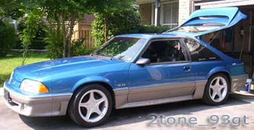 K&N, 70mmT/B, Cobra upper&lower intakes, BBK Underdrive pullies, Mac Longtubes, Prochamber H-pipe, 355's, Pro 5.0shifter, Recaro seats, Momo steering wheel, Tokiko's, Eibachs, Frame conn, Dech skirts, Monster stereo with four 10" subs with custom plexiglass and velour installation.