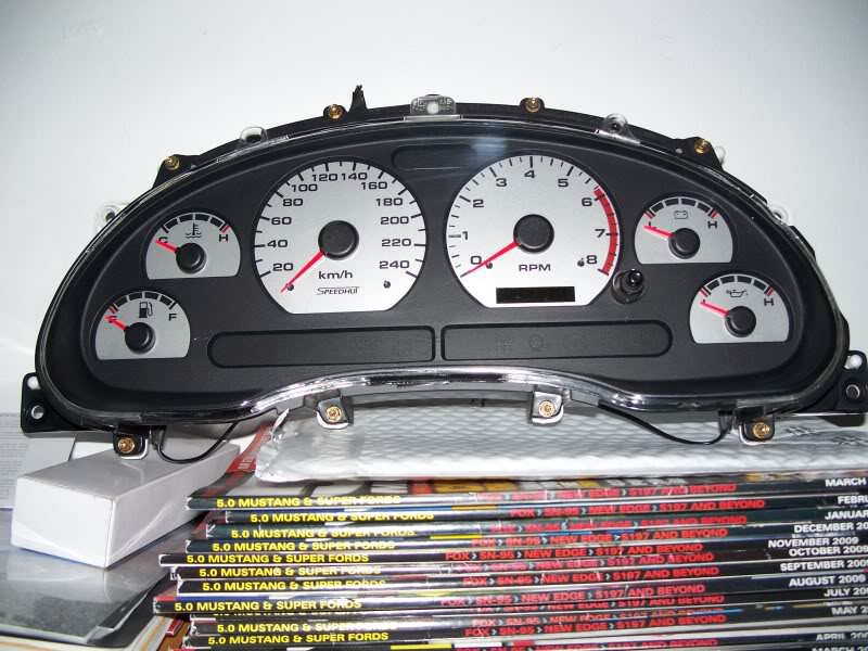 A few weeks ago i broke down and ordered some metallic silver faced gauges for the GT from Speedhut.They finally came in this week.I wanted my cluster gauges to match my Auto Meter Ultra Lites that are silver faced,and wanted them in e glow aswell so it would flow.I am very happy with the quality of them,and they were easy to put on,none of the needles needed removal for the install,they just slide over the needles with ease,but with care.So all i need to do this weekend is get the cluster back in,and wired up.I'll take more pics once they are back in the GT.:tup