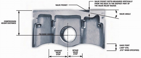 The side view shows the deck, dome height, lands, forced pin oilers, lock grooves, skirt and other elements, while the side cutaway view points out the compression height distance, valve pocket, valve angle, pin bore center, gauge point, and valve pocket depth. Finally, the top view shows us things like the intake and exhaust centerline out, intake and exhaust valve relief, and the valve stops. Armed with this information, never again will you be lost when in conversation with an engine builder or piston manufacturer. So, get to studying.