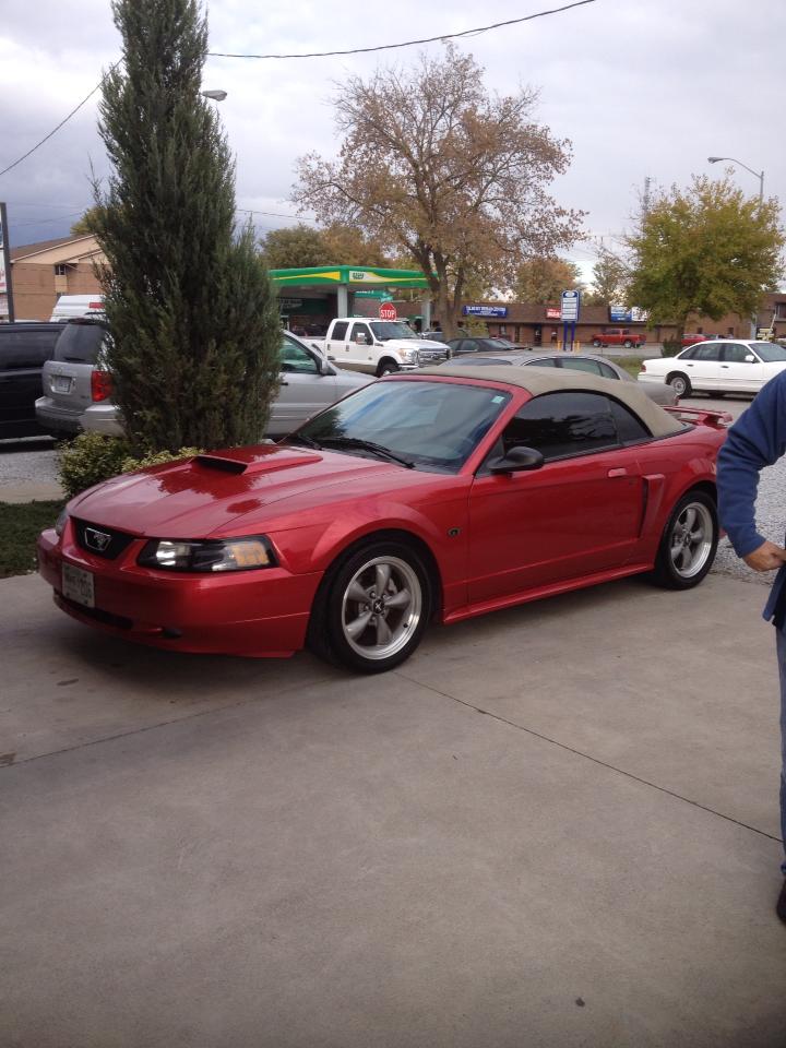 Sorry it took me so ling to introduce myself. But my Name is Rick and I have a laser red 01 gt convertible. Its pretty much just bolt on at the moment but I am looking at forcing it. Right now mods are BBK shorty headers, bbk cats and cat back, mac mufflers, steeda underdrive pulleys, tremec short throw, 3;73 gears, CC plates, b&m cold air., dyno tuned by dasilva's in Toronto and pulled 264 hp before I added the headers so maybe 270? As far as apearance mods it has been lowered a 1 1/2 inches, saleen staggered 18X9/10 inch rims, with bf goodrich KDW T/A shoes, 01 cobra front fascia( not installed yet but will in a couple weeks), sequential LED tail lights, CDC light bar.