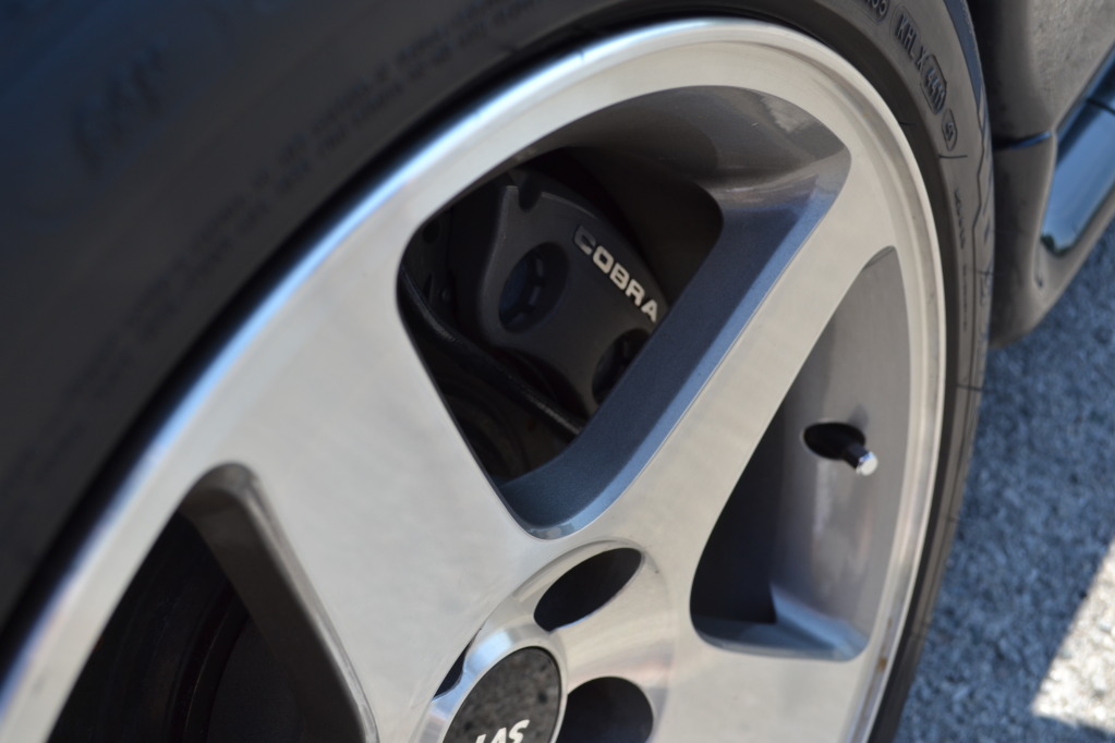 King Cobra clutch, B&M Short Shifter, Ford Racing Aluminum Drive Shaft, 4:10 gears, Cobra brakes, EBC Slotted and Dimpled Rotors, Hawk HP Plus pads, Roush front sway bar, Steeda Billet Castor/Camber plates, HR springs with adjustable shocks and struts