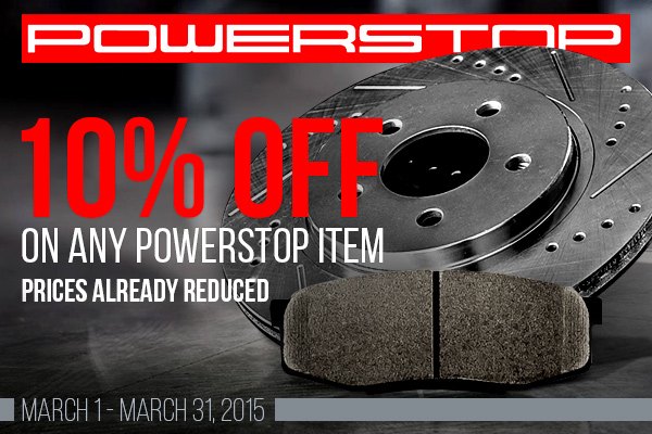 10% discount is available on all Powerstop products, such as Brake Pads, Brake Rotors, Calipers, Pad Wear Sensors, Brake Kits and Caliper Kits!