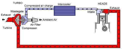 Please note, I got this from another site. It is not my information, but I figured I would help those interested in turbo installing. Part 1 Summary: This is part one of a series of pages on how you can install a Turbo system on your loved stang. There is a need for such a write-up since most people lack the sums of money needed to buy one of the available kits in the aftermarket. Such systems are priced above the $3.5k figures, a bit too much for most people. We hope that with this material you will be able to make your own Turbo setup, either a single or twin turbo. Most of the stuff that you will need can be found NEW from several sources or USED from you local car-junker. In part 1 we will try to explain in simple terms what a Turbo setup is all about. We won't go into complex details and formulas, for that we recommend the following books: Turbochargers by Hugh MacInnes (buy direct) Maximum Boost - Designing, Testing, and Installing Turbocharger Systems (buy direct) The following parts in the series will try to cover specific details of what and where to purchase, 5.0 engine especific installation diagrams, actual junkyard twin turbo installation and a final chapter on tuning your setup. Details: Part 1 | Part 2 | Part 3 | Part 4 | Part 5 Part 1 -------------------------------------------------------------------------------- PART 1: TURBO BASICS The exhaust gases exit through the exhaust manifolds or headers and into the Turbo. Exhaust gases then move the Turbine wheel and exit the housing through the exhaust pipes and to the atmosphere. The Turbine and Compressor Wheels are joined by a shaft which is lubricated by engine oil. The compressor wheel pulls the filtered ambient air and compresses it. The compressed air then moves into an intercooler to cool the air charge. After the intercooler, the air charge moves into the Throttle body and intake. The Compressed air charge enters the cylinders in a "compressed state" and so it enables the engine to draw more air into the chambers, this "synthetic" increase in compression is called "dynamic compression" or in other terms "forced induction". This increased compression enables the engine to behave like a larger displacement engine. Attachment 24445 Typical Turbo System Parts Turbo: Complete housing with Wastegate, Turbine and Compressor Intercooler: cools Compressed air charge Wastegate: Valve that controls the boost amount by releasing exhaust gases to the exhaust before they reach the turbine. Considerations FUEL: One of the priciples of internal combustion engines is that for any amount of fuel there's a need for a given air charge. In the case of Turbos AND supercharger systems, the Increased air charge needs a proportional increase in fuel delivery. The consequence of a LEAN air fuel mixture (or lack of fuel) is called Detonation. Detonation is the main concern on forced induction engines since it can cause severe damage to the engine. On a stock 5.0 liter the fuel injectors are small, and at medium boost levels, the 19lph (pounds per hour) stock fuel injectors might not be enough to compensate for the increase in air charge. COOLING: Another point of high importance is to make sure your cooling system is operating properly, the increased compression at the cylinder heads will cause an increase in engine temperature. EXHAUST: The increase in exhaust flow and turbo backpressure makes very important to have a good exhaust system, what goes in must go out. IGNITION: With the increase in cylinder pressure, a better spark will be needed to ignite the air/fuel mixture. This can be achieved by reducing plug gap and/or installing an aftermarket ignition system or a better coil. At low boost levels reducing plug gap could be the only needed ignition modification. Twin Turbo and Single Turbo selection Before you start the search for a TURBO, there are some considerations you might need to address first: Will it be a single or twin setup? How big a Turbo do i need? For any given Turbo model are there any variations? What about intercoolers? To answer some of these questions lets just say that you have to choose your turbo(s) depending on their capabilities, a small Turbo such as the ones you find in small displacement engines like a Nissan 1.3L will be too small for a V8 5.0 or 4.6. Others such as DIESEL engine Turbos might be too big. In order to help you decide what brand-type of turbo you need, the next application can help you a lot. Instructions: Engine type: select gasoline (or diesel if you have a 5 ton truck) Number of Turbos: its your choice, we will later explain some pros-cons of both setups. Intercooler: YES, this is the most efficient setup, you won't regret it. Engine Capacity in CC's: for both 5.0 and 4.6 select 5,000 Maximum RPM: again your choice...will depend a lot on your actual modifications. For a Stock 5.0 or 4.6 select 6,000 +/- BOOST: how much you want/need? a safe limit for a STOCK 5.0 or 4.6 will be 8psi. Now that you selected your dream setup you might have the following results: For Single Turbo: Garret T04 probably V1 trim For Twin Turbo: Garret T3 trim 45 Note that for every type of Turbo there are different "trim" versions, each trim has different turbine and compressor designs that promote a given characteristic such as volumetric efficiency, speed, etc. Both setups have almost the same BHP capabilities, but there are some pro's and con's to each setup. A Twin turbo setup will probably be more efficient than a single one at low RPMs but it is certainly more difficult to install. The single turbo setup could have lower boost at low RPMs but a bit more on top and is easier to maintain and install. This considerations could be affected by several variables, compressor and turbine design, piping, intercooler efficiency, etc. But consider the above assumptions as "valid" for most "stock" turbos you will find in a junkyard. Intercooler choice: There are some guidelines you might want to follow, choose and intercooler
