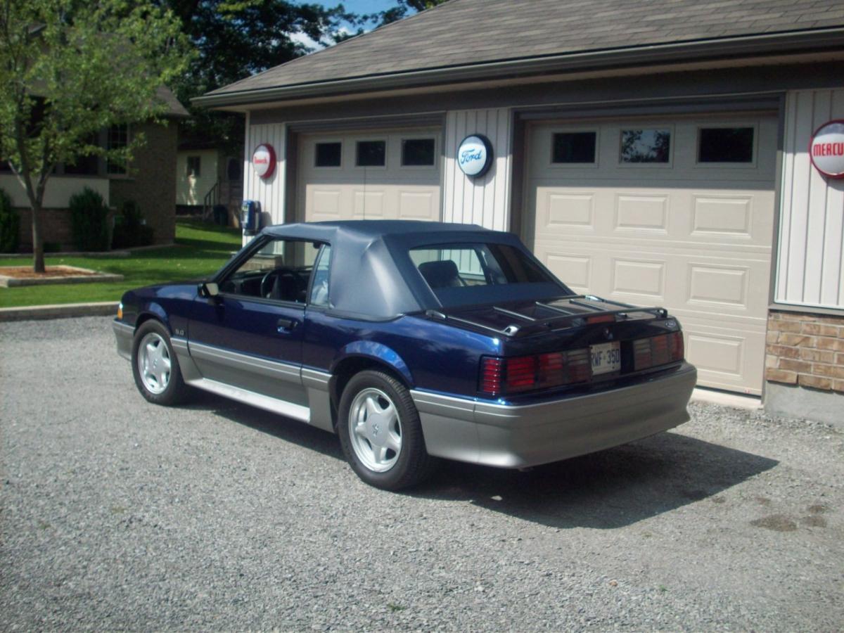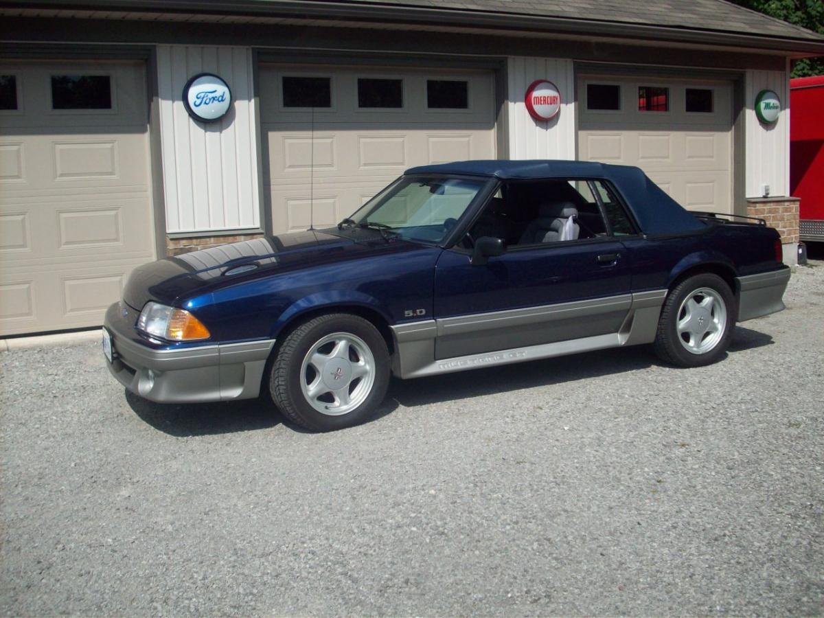 1993 gt convertible stock fox body with 5.0 engine and automatic transmission colour is royal blue with blue top and grey interior power locks windows mirrors seat ac this car is mint it has only 1470 kms never saw rain i am the original owner it is for the discriminating mustang collector also included is a car cover and bra. Thanks