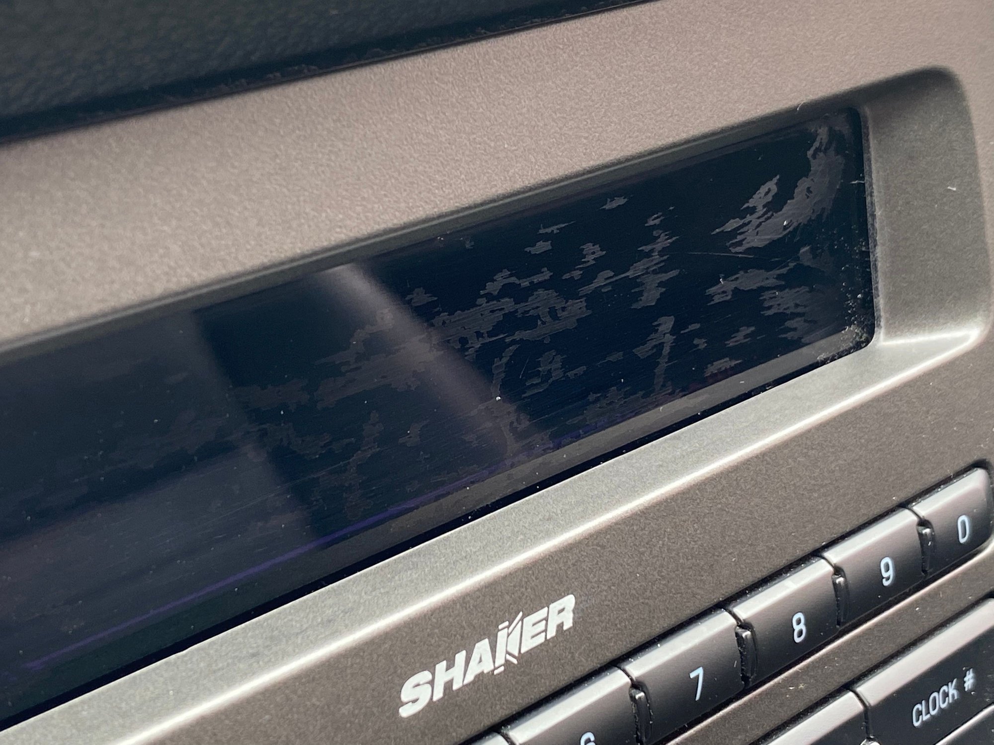 I recently purchased a 2014 convertible. The Shaker Stereo Screen is etched from, what I assume, being cleaning with an inappropriate product. Any tips on fixing this. Makes it very hard to read the screen when the top is down.
